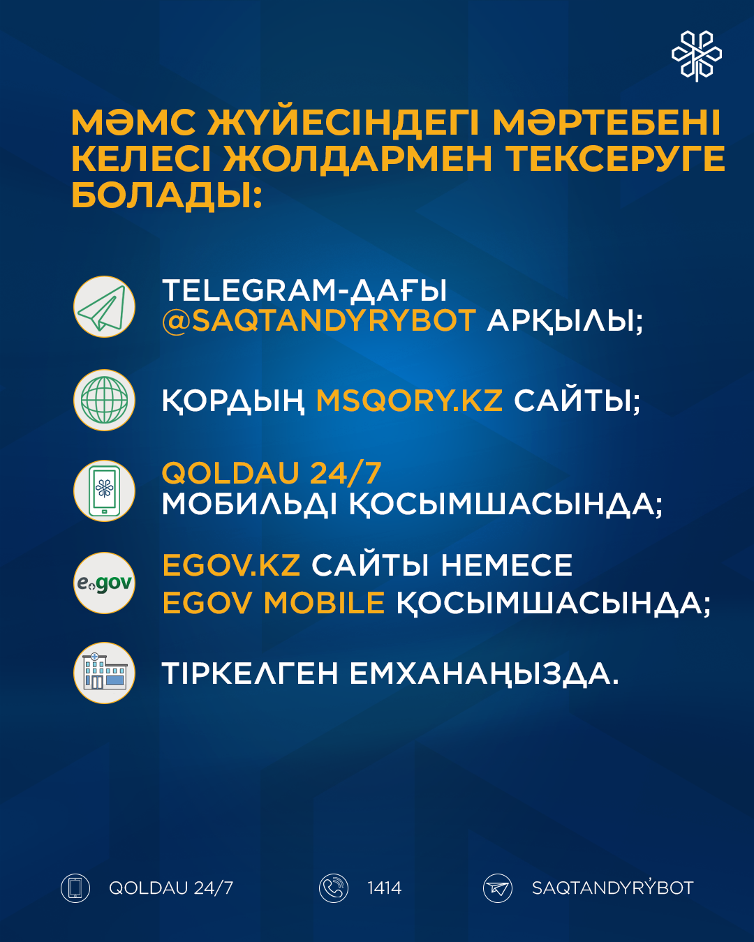 (Жауап: Медициналық көмек алу үшін өзіңізді-өзі жұмыспен қамтушы ретінде жарна төлеу қажет (4250 тг/ай, 51 000 тг/жыл). МӘМС шеңберінде барлық көрсетілген қызметтер, дәрі-дәрмекпен қамтамасыз ету кіреді).