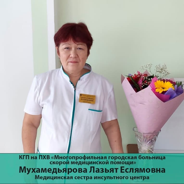 В инсультном центре Многопрофильной городской больницы скорой медицинской помощи непрерывно с 1979 года работает медицинская сестра Мухамедьярова Лазьят Еслямовна. В 2021 году за большой вклад в здравоохранение нашей области была у Вас появится время, чтобы реализовать то, что давно задумано и до сих пор откладывалось. Мы надеемся, что вы нас не забудете, будете поддерживать с нами связь и радовать своими новыми успехами вне нашей организации. Ну а мы будем помнить вас как прекрасного коллегу, отличного друга, надежного члена нашей команды и если позволите, будем иногда пользоваться вашим опытом, компетентностью и спрашивать совета. Пусть наступающий период вашей жизни станет для вас самым счастливым временем и принесет только радость.