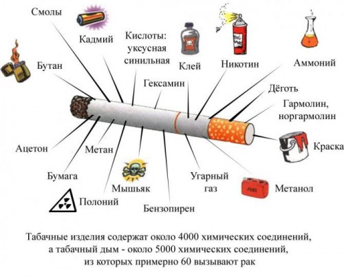 Помимо никотина в табачном дыму обнаруживается ряд других опасных химических веществ, таких как смолы, радиоактивный полоний, мышьяк, свинец, висмут, аммиак, органические кислоты. Случаев острого отравления этими веществами практически не наблюдается в связи с тем, что в организм они поступают медленно, дозированно, однако эти вещества приводят к постепенному ухудшению здоровья.