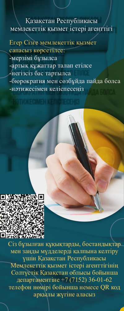 Мемлекеттік қызметтерді қөрсету жөніндегі мәселелер бойынша телефон: +7 (7152)-51-56-44