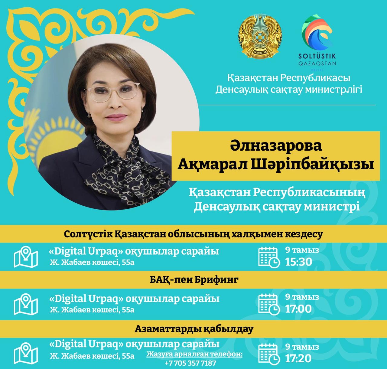 Министр здравоохранения РК встретится с населением Северо-Казахстанской области. 9 августа 2024 года состоится встреча министра здравоохранения РК Альназаровой Акмарал Шарипбаевной с жителями Северо-Казахстанской области. Встреча пройдет по адресу: г. Петропавловск , ул. Ж.Жабаева 55А, Дворец школьников 15.30 - встреча с населением; 17.00 - брифинг с региональными средствами массовой информации. 17.20 - личный прием граждан; Ваши вопросы и предложения вы можете задать на встрече с министром или направить, используя следующие каналы связи: WhatsApp номер: +7 705 357 71 87 или на электронный адрес: Бұл электронды пошта мекен-жайы спам-боттардан қорғалған. Көру үшін сіздің браузеріңізде JavaScript қосулы тұруы тиіс. Телефон для записи на личный прием: +7 705 357 71 87, запись производится до 21:00, 08.08.2024 года Приглашаем граждан принять активное участие и задать вопрос